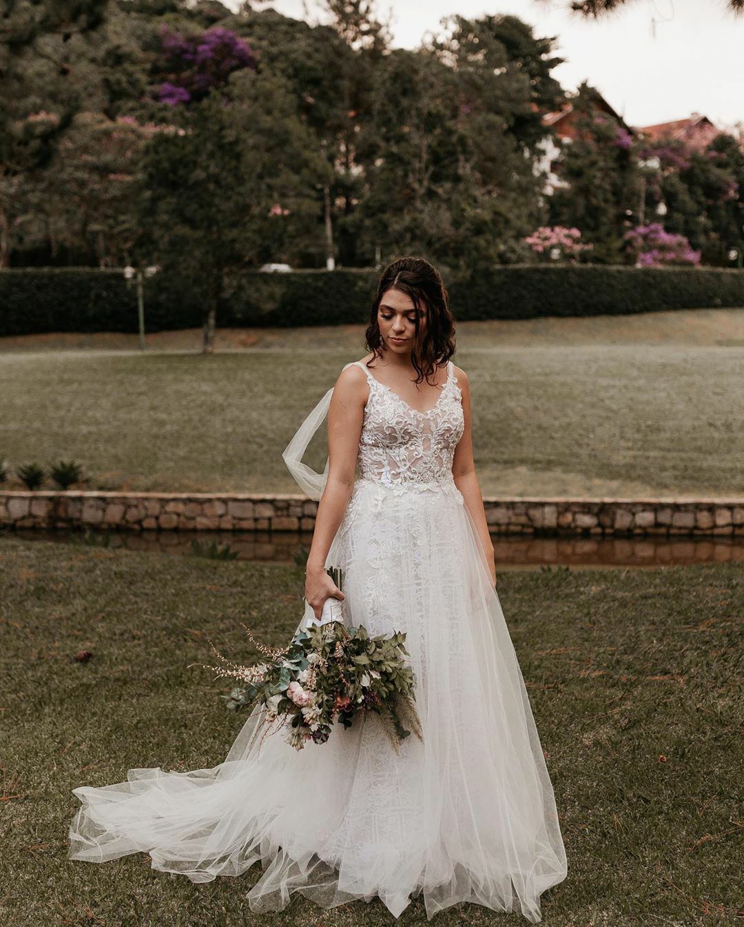O casamento da nossa noiva Júlia aconteceu em uma simpática cerimônia ao ar livre em Teresópolis, no Rio de Janeiro. Para combinar com o clima serrano, a Júlia escolheu vestido no estilo boho – um modelo todo de renda com corte em A e saia com sobreposição de tule. As alças com amarração também deram um toque bucólico e imprimiram fluidez ao look, além de destacarem o decote nas costas – que combinou super bem com o corte de cabelo e penteado da nossa noiva. Veja algumas fotos do ensaio: