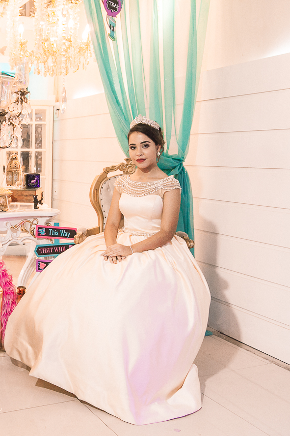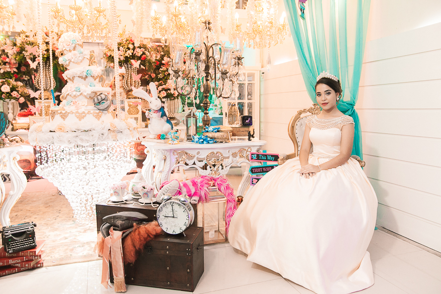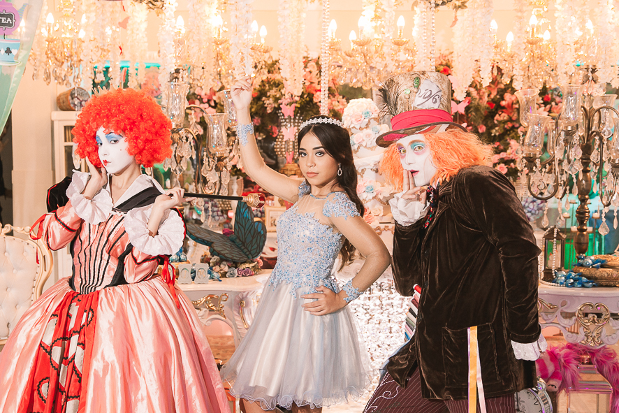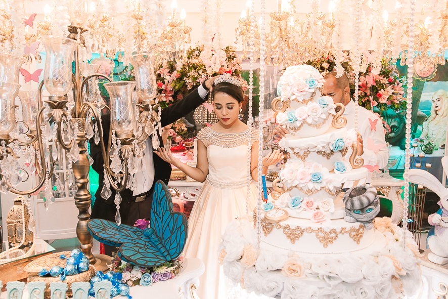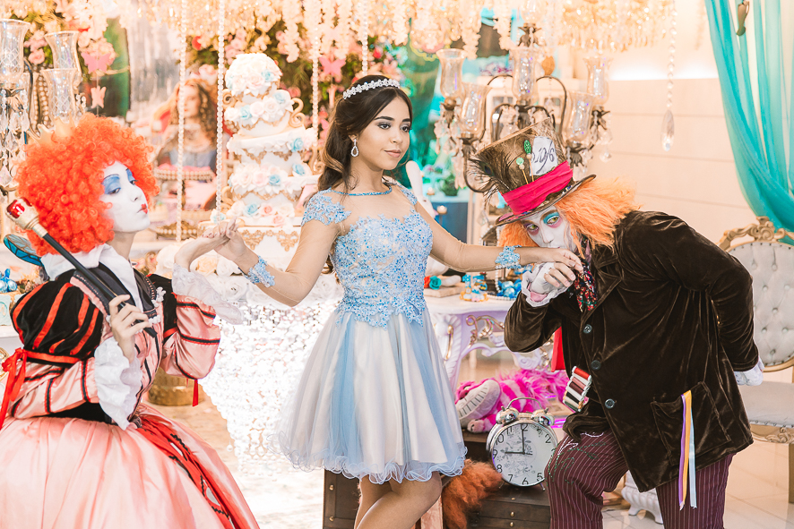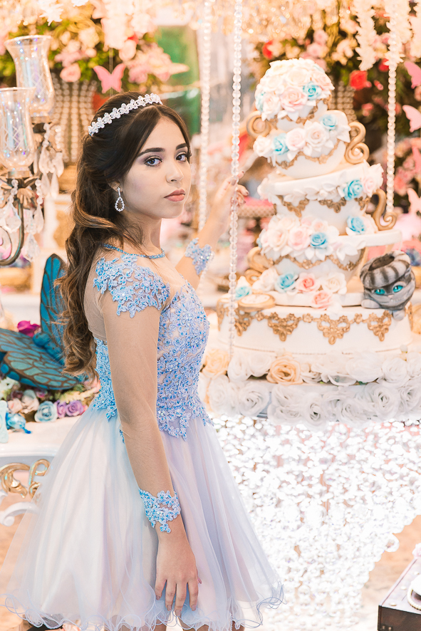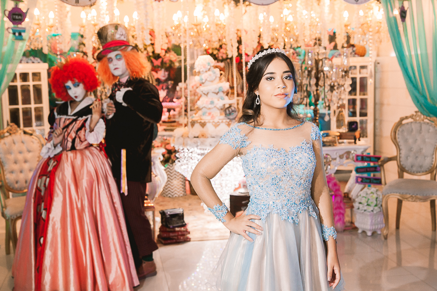 O tão sonhado dia da nossa linda Princesa Yasmin chegou, cada momento, cada detalhe dessa data foi pensado e cuidado com todo carinho. A Debutante escolheu o belíssimo tema: Alice no País das Maravilhas para o seu grande dia, e arrasou com a decoração, simplesmente maravilhosa e bem original! Yasmin, escolheu o azul, perolado e o rose para os seus três Modelos de Vestidos de 15 anos.