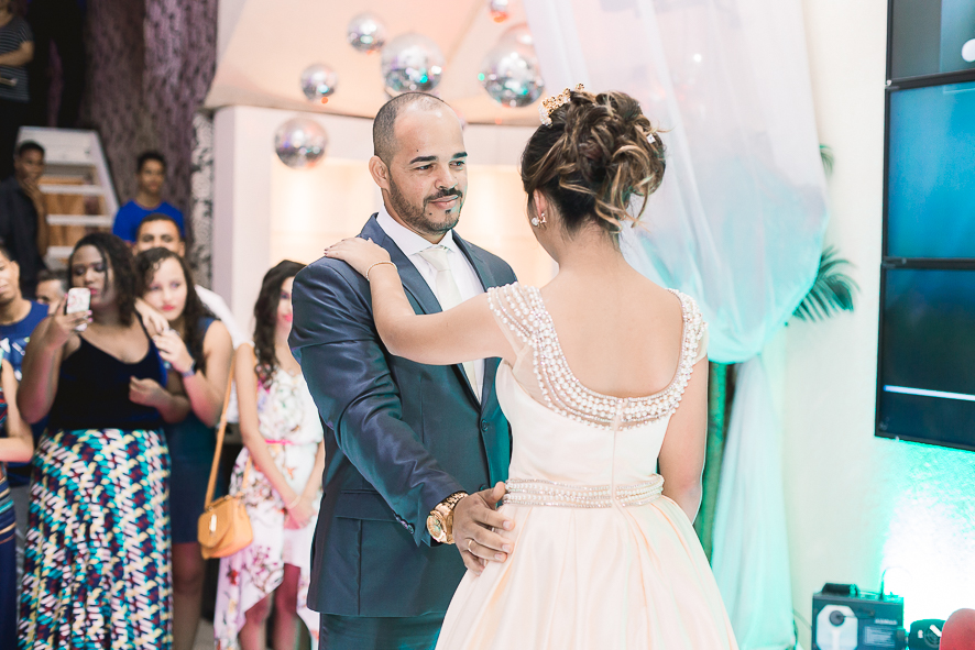 Já, para a Valsa, momento muito esperado pelos convidados, Yasmin usou o Clássico Vestido Longo todo trabalhado no cetim bucol em tom perolado, com detalhes no colo em pérolas e pedras brilhantes.